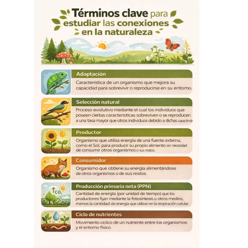 En la naturaleza encontramos muchas conexiones, así por ejemplo los organismos fotosintéticos son llamados productores, capaces de producir su alimento y por tanto autótrofos. Mientras los organismos que se alimentan de otros son llamados consumidores y pertencen a los heterótrofos. La evolución en estos organismos conlleva necesariamente una coevolución que provoca la adaptación. En la INFOGRAFÍA hay una serie de términos claves que nos ayudan a entender estas conexiones.